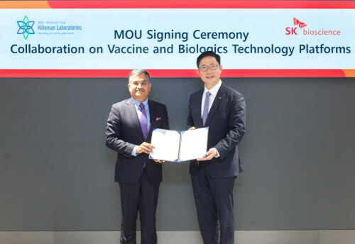 | ▲ 지난해 10월 '신규 백신 및 플랫폼 공동 연구개발을 위한 업무협약' 체결식에 참석한 힐레만 연구소 라만 라오(Raman Rao, 왼쪽) CEO와 SK바이오사이언스 안재용 사장 (사진=SK바이오사이언스 제공) |