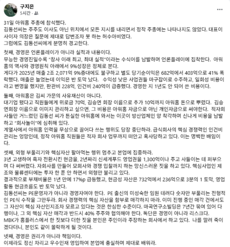 구 전 부회장은 지난 3월 말 주주총회 직후 사회관계망서비스를 통해 "경영은 언론플레이가 아니라 실적과 내용"이라며 회사 측이 발표한 ‘창사 이래 최대 실적’이라는 평가를 정면으로 반박했다. 그는 현 경영진의 성과 홍보가 실질적인 내실과는 거리가 멀다고 주장했다.
