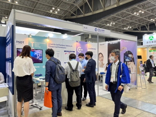 | ▲ 2022 바이오-재팬(Bio-Japan) 셀리버리 부스를 방문한 글로벌 제약사 담당자에게 TSDT 기술을 설명하는 모습 (사진=셀리버리 제공) |