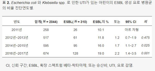 최근 분당서울대학교병원, 중앙대학교병원, 서울성모병원, 삼성창원병원, 대전성모병원 소아과 의료진이 2011년부터 2017년 사이 4개 지역에 위치한 4개 병원에서 요로감염이 진단된 24개월 미만의 어린이 2159명을 분석한 결과 소아는 확장 스펙트럼-β-락타마제(ESBL) 생성 요로 병원체에 의한 감염 위험 증가와 관련이 있다는 사실을 확인했다고 밝혔다.