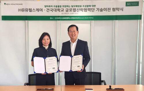 | ▲ 유유헬스케어 유경수 대표이사(좌) 건국대학교 바이오의약학과 임병우 교수(우) (사진=유유헬스케어 제공) |