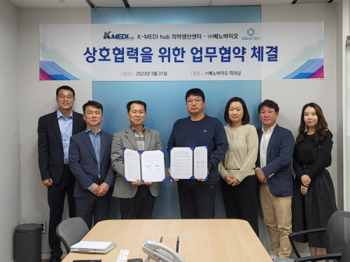 | ▲ 케이메디허브가 베노바이오와 혁신 신약 개발을 위한 MOU를 체결하였다. 사진은 MOU체결 후 기념촬영하는 모습.(사진=케이메디허브 제공) |