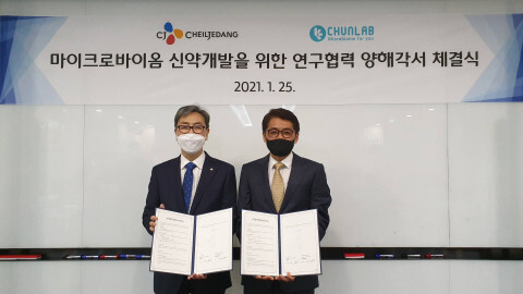 지난 25일 CJ제일제당 본사에서 CJ제일제당 황윤일 BIO사업부문장과 천랩 천종식 대표이사 및 업무 관계자들이 참석한 가운데, 마이크로바이옴 신약개발을 위한 전방위적인 연구협력 양해각서를 체결하고 공동연구를 추진하기로 했다.