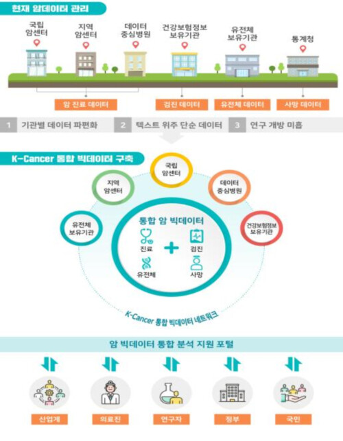그 첫걸음으로 전체 암 환자데이터의 70%를 차지하는 300만명 규모로 한국인 주요 암 10종에 대해 전국 암 병원의 ▲암 진료데이터(영상 포함)와 ▲건강검진 데이터 ▲유전체 데이터 ▲사망통계 등을 연계한 한국형 암(K-Cancer) 통합 빅데이터를 구축할 예정이다.