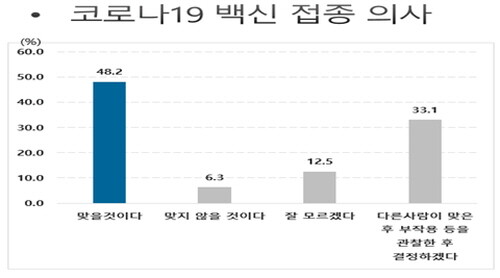조사결과 코로나19 백신을 접종하겠다는 응답은 48.2%이었고 다른 사람이 맞은 후 부작용 등을 관찰한 후 결정하겠다는 응답(33.1%)과 잘 모르겠다는 응답(12.5%)이 45.6%이었으며 백신을 접종하지 않겠다는 응답도 6.3%로 나타났다.