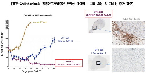 | ▲툴젠과 CARtherics가 공동연구한 TAG-72 CAR-T의 난소암 전임상 동물 모델에서의 치료효능 및 지속성 증가 (왼쪽 그래프) 및 CAR-T의 암 침투 증가 (사진=툴젠, CARtherics 제공) |