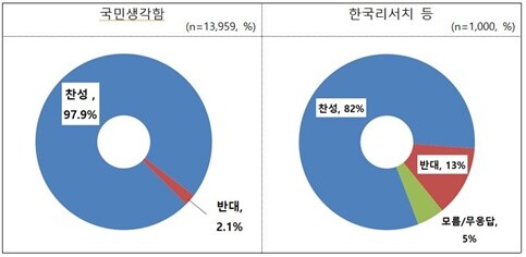 또한 이번달 24일 한국리서치 등 4개 여론조사기관에서 전국 만 18세 이상 남녀 1006명을 대상으로 같은 내용을 조사(표본오차 95% 신뢰수준에서 ±3.1%포인트)한 결과, 찬성하는 답변이 82%, 반대의견이 13%, 모름/무응답 5%로 집계됐다.