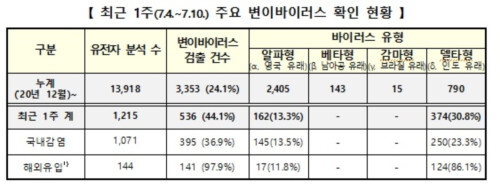 최근 1주 추가로 확인된 주요 변이바이러스 확진자는 536명으로 바이러스 유형별로는 알파형 162명, 델타형 374명이었고, 이 중, 141명은 해외유입 사례, 395명은 국내감염 사례였다.