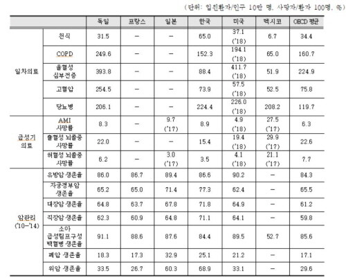 일차의료 관련 지표 중 우리나라는 만성폐쇄성 폐질환과 울혈성 심부전증, 고혈압의 인구 10만 명당 입원환자가 OECD 평균에 비해 적으므로 우수한 수준이다.