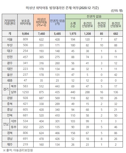 친권자가 없는 위탁아동 중 후견인 선임이 필요함에도 이뤄지지 못한 아동이 가장 많은 지자체 역시 경기(153명)로 그 다음으로는 부산(88명), 경북(86명), 서울(67명), 전북(50명), 전남(49명), 울산(42명), 충북(32명), 강원(26명), 경남(26명), 충남(21명), 광주(12명), 인천(11명), 대전(11명), 대구(6명), 제주(2명) 순서였다. 세종은 한 명도 없었다.